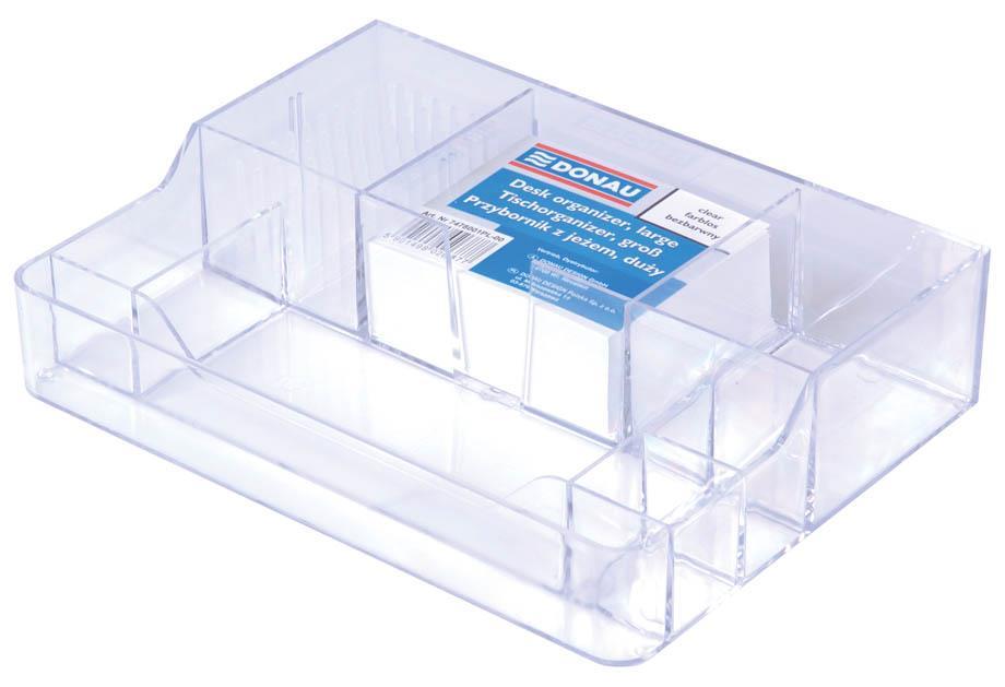– predel za papirne lističe (pribl. 300 kos priloženih) – predel za pisala (62x80mm) – predel za pisala, ravnilo (223x15mm) – predel za manjše pisarniške dodatke (62x80mm) – predel za večje pisarniše dodatke ( 151x60mm) – 3 predeli za manjše pisarniške dodatke (radirko, šilček itd.) – izdelan iz prosojnega polistirena, odpornega na lomljenje – dimenzije: 230x170x50mm