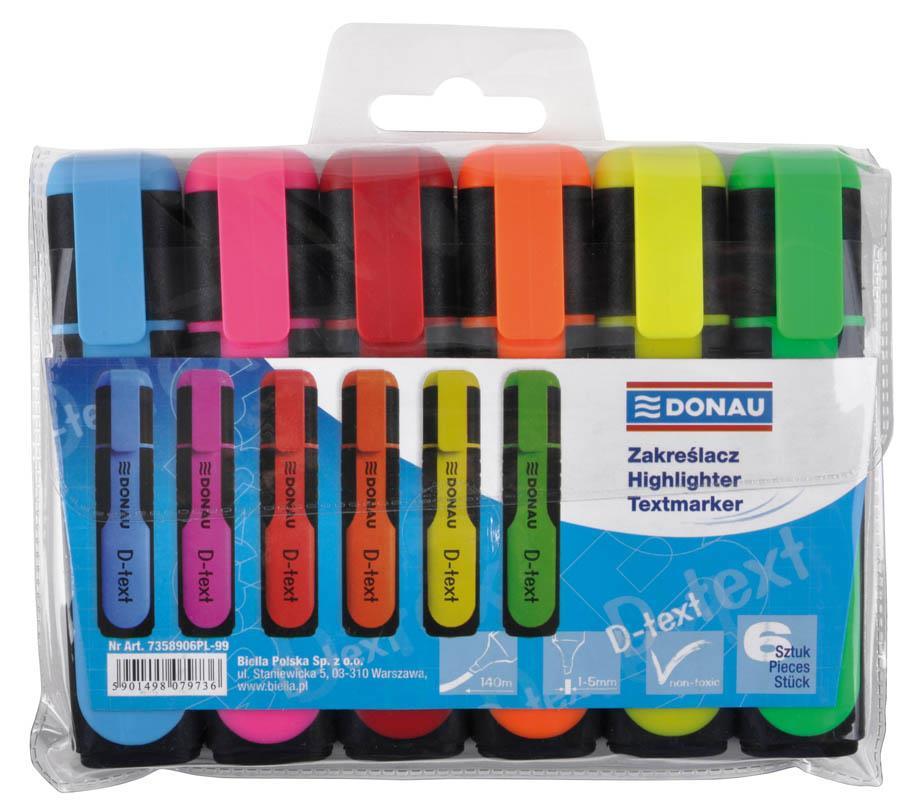 – za označevanje teksta na skoraj vseh tipih papirja – nestrupeno, učinkovito in trajno črnilo, ki se ne razmaže – gumirano držalo za boljši oprijem – klasična oblika pisala – poševna konica – širina sledi: 1-5mm – v kompletu 6 barv: modra, roza, rdeča, oranžna, zelena in rumena