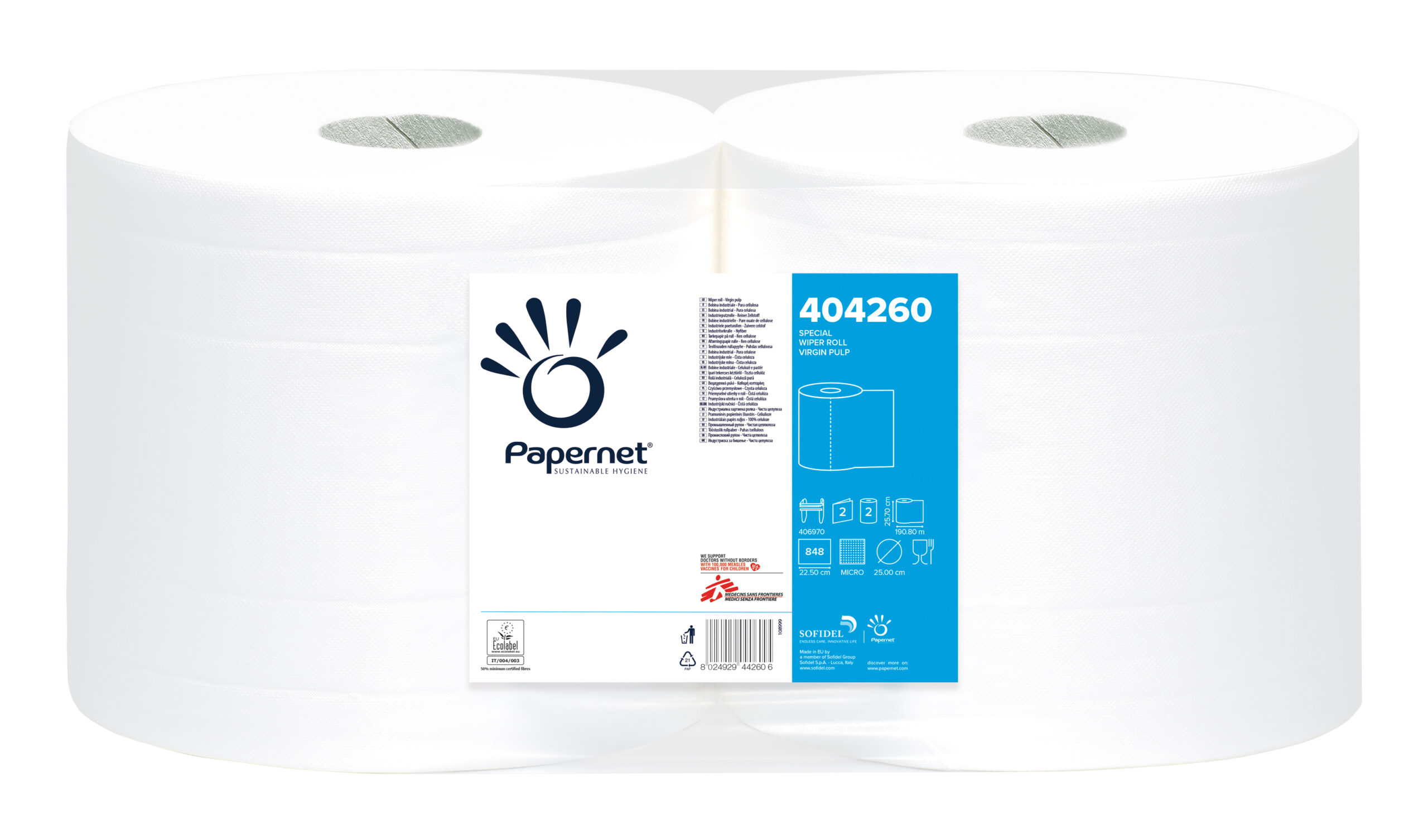 celulozni material 2 sloja Ecolabel 848 listov v zvitku pakiranje 1/63 dolžina zvitka 190,80 m premer lista 22,50 cm x 25,70 cm višina zvitka 25,70 cm premer tulca 6, 00 cm premer zvitka 25,00 cm idealno za industrijske obrate primerno za brisanje rok, pa tudi za brisanje olja in maščob kompatibilno z držalom 406973