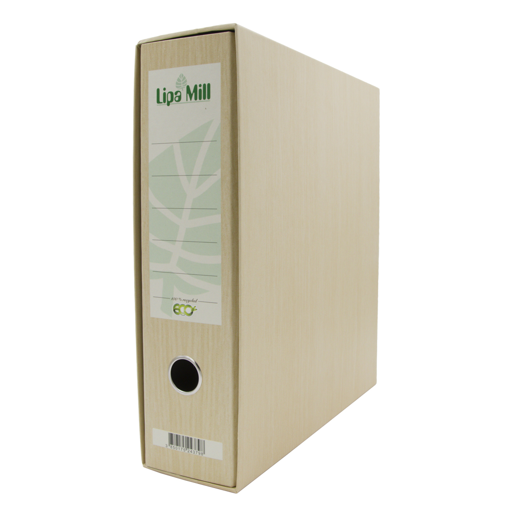 vložek iz sive lepenke debeline 1,75 mm, premazan z ofsetnim papirjem 100gr škatla iz sive lepenke debeline 1,25 mm, premazana z ofsetnim papirjem 115 gr format A4, hrbet 80 mm barvni ECO Cylus tisk embalaža 1/11/231